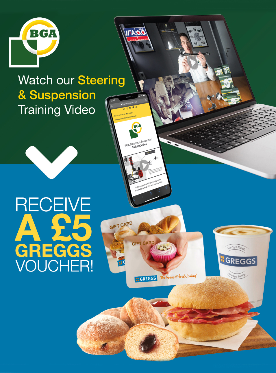BGA Steering & Suspension product range. To be able to claim your £5 Greggs voucher, make sure you watch the video the full way through!